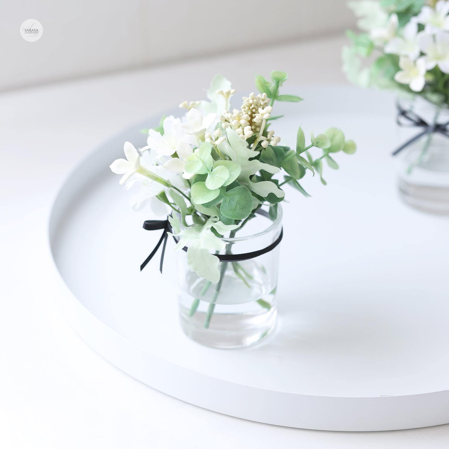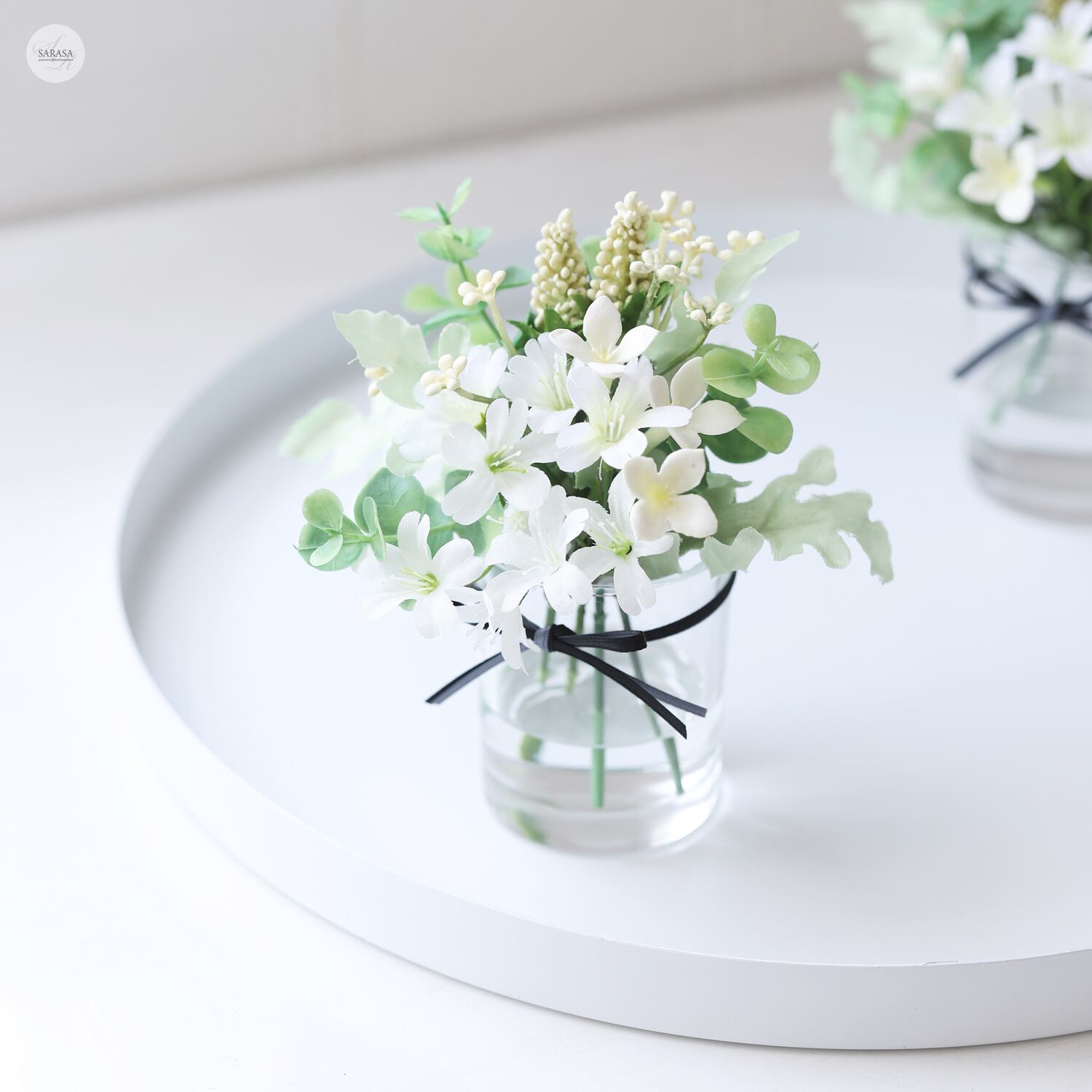 ホワイトの小花とユーカリをガラスベースに入れたシンプルなアレンジです。手のひらサイズです。