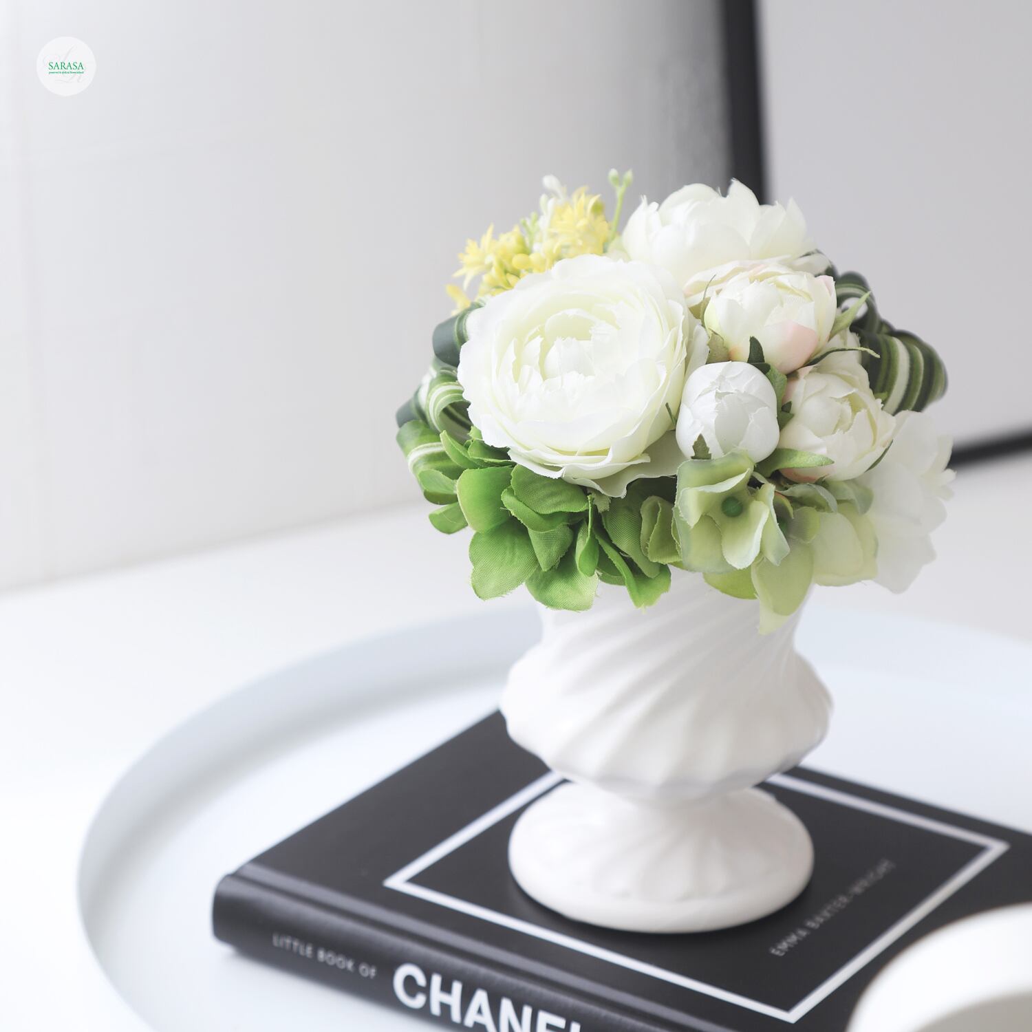 白い陶器に2種類のホワイトローズとライトイエローの小花、