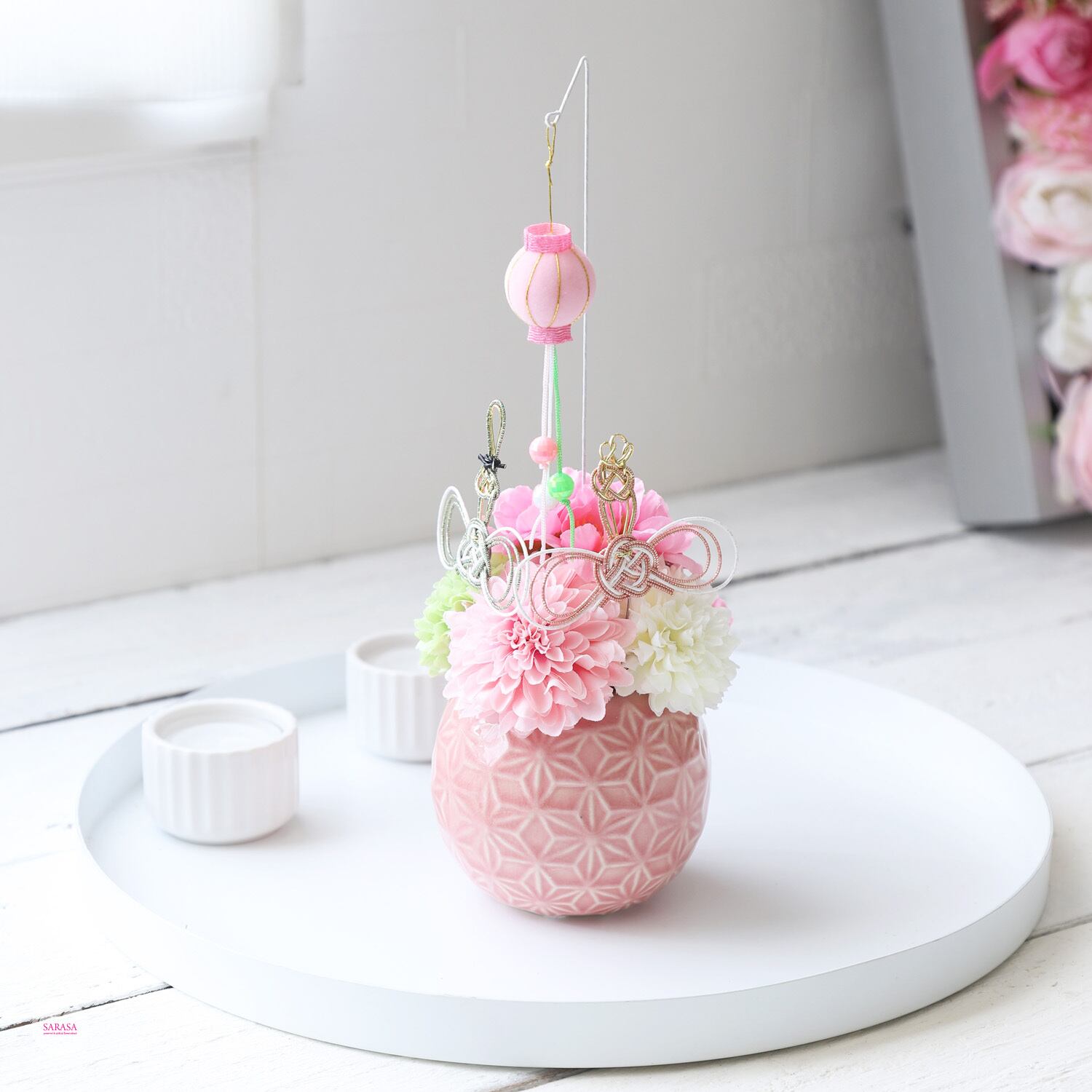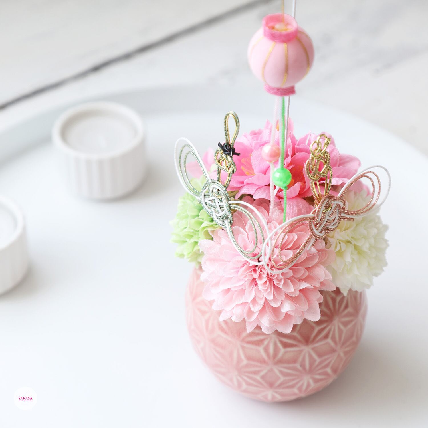 桃の花とマムにお内裏様とお雛様の水引飾りに